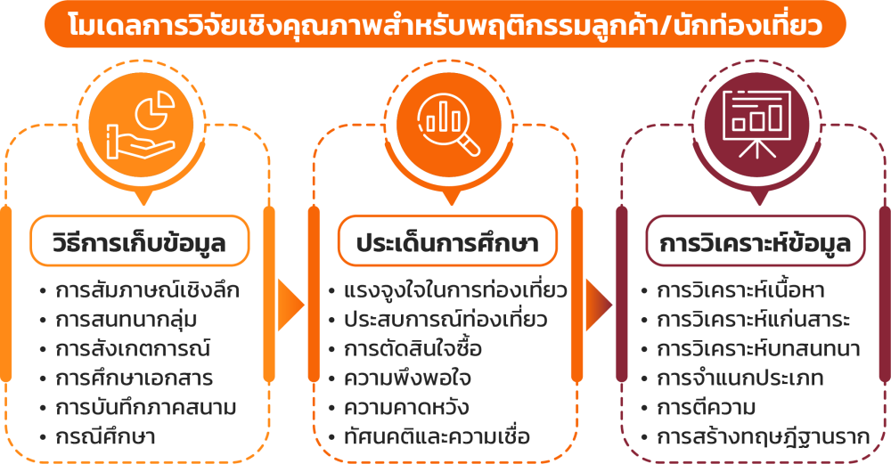 การวิจัยเชิงคุณภาพมุ่งเน้นการทำความเข้าใจเชิงลึกเกี่ยวกับพฤติกรรม ทัศนคติ และประสบการณ์ของลูกค้า/นักท่องเที่ยว โดยใช้วิธีการเก็บข้อมูลที่สำคัญ ได้แก่