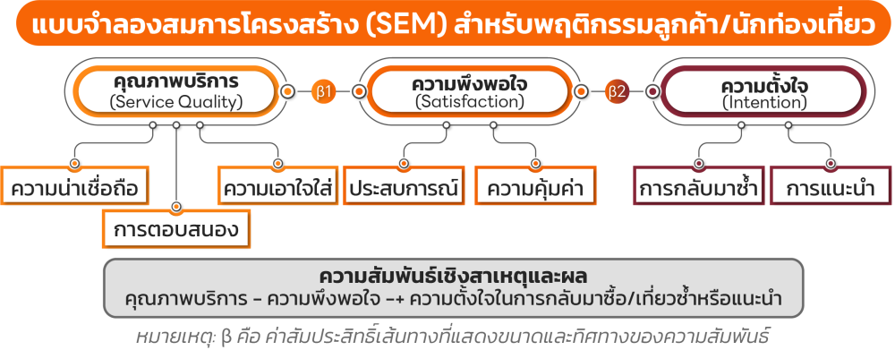 โมเดล SEM ข้างต้นแสดงความสัมพันธ์เชิงสาเหตุระหว่างตัวแปรแฝงสำคัญในการศึกษาพฤติกรรมลูกค้า/นักท่องเที่ยว