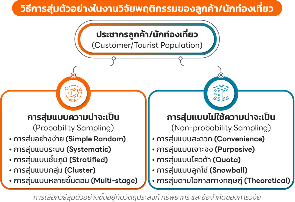 แผนผังนี้แสดงแนวทางการเลือกกลุ่มตัวอย่างจากประชากรลูกค้า/นักท่องเที่ยว (Customer/Tourist Population) ซึ่งเป็นขั้นตอนสำคัญในการเก็บข้อมูลอย่างมีประสิทธิภาพ โดยแบ่งออกเป็น 2 ประเภทหลัก ได้แก่: